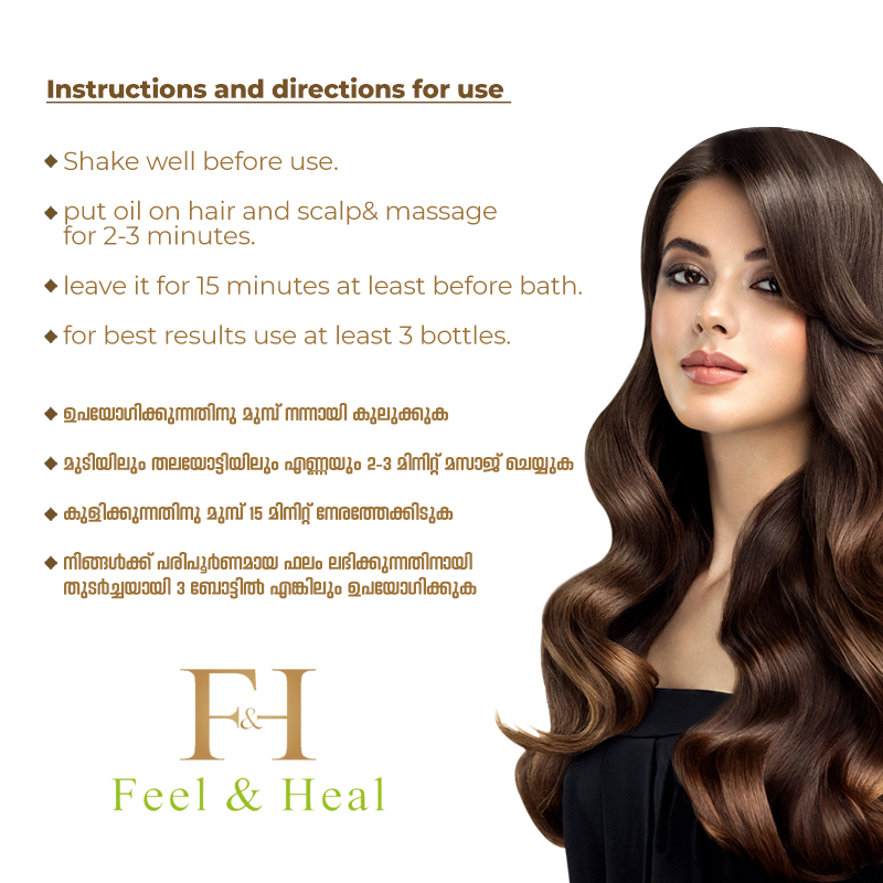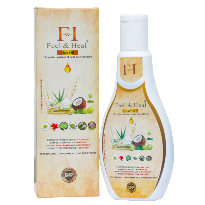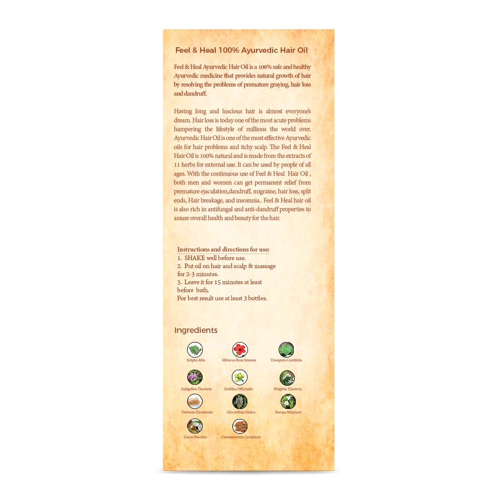 Feel & Heal Ayurvedic Hair Oil is a 100% safe and healthy Ayurvedic medicine that provides natural growth of hair by resolving the problems of premature graying, hair loss and dandruff.